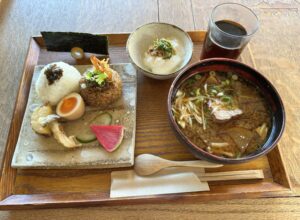 秋の紅葉の中、信楽にドライブに行きました。お目当ては「信楽手しごと展」(10月11日〜12月7日)です。陶芸の森 産業展示館で展示を見てから館内にある「山とおむすび 銀月舎」でお昼をいただきました。豚の角煮と野菜がたっぷり入った味噌汁に朧豆腐とおにぎり2個(自分で選べます)の定食をいただきました。九谷焼の展示、「九谷赤絵の極致」も素晴らしかったです。こちらは12月14日までです。おみくじを引きました。箱に入った信楽焼のぐい呑みを買うと裏に中吉と書いたぐい呑みが当たりました。やさしい色合いのぐい呑みでした。夜はこのぐい呑みでお酒をいただきました。美味しかった〜